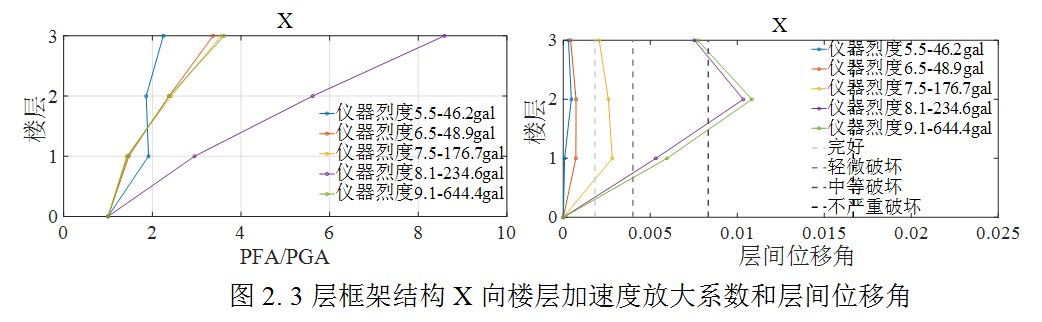 為評估結構在此次地震動的破壞水平,選取了實際記錄到的儀器烈度對應的5組強震記錄,開展了針對當地抗震設防烈度為8度0.2g的5棟典型鋼筋混凝土結構房屋的非線性動力響應時程分析。5棟結構包括1棟框架、2棟框剪及2棟剪力墻,結構基本周期從小到大分別是0.47s,0.78s,0.84s,1.5s和2.5s。分析主要給出了對結構安全和建筑內人員體感影響明顯的層間相對位移和樓層加速度響應結果。表2為選取的地震動記錄相關信息。圖1為選取的5棟結構的有限元模型示意圖,圖2至圖6為五棟結構的初步分析結果。
