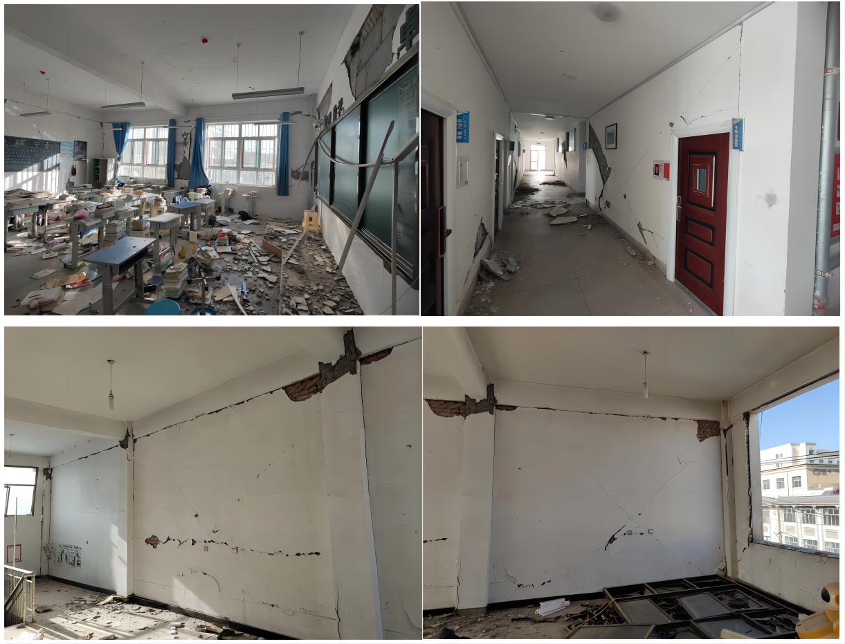 1.調查大河家中學教學樓、實驗樓、食堂和學生宿舍的震害情況。其中,4個結構的結構構件均無明顯破壞,非結構構件砌體填充墻、吊頂破壞嚴重。雖無倒塌風險,但使建筑的使用功能中斷。