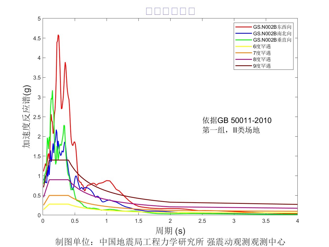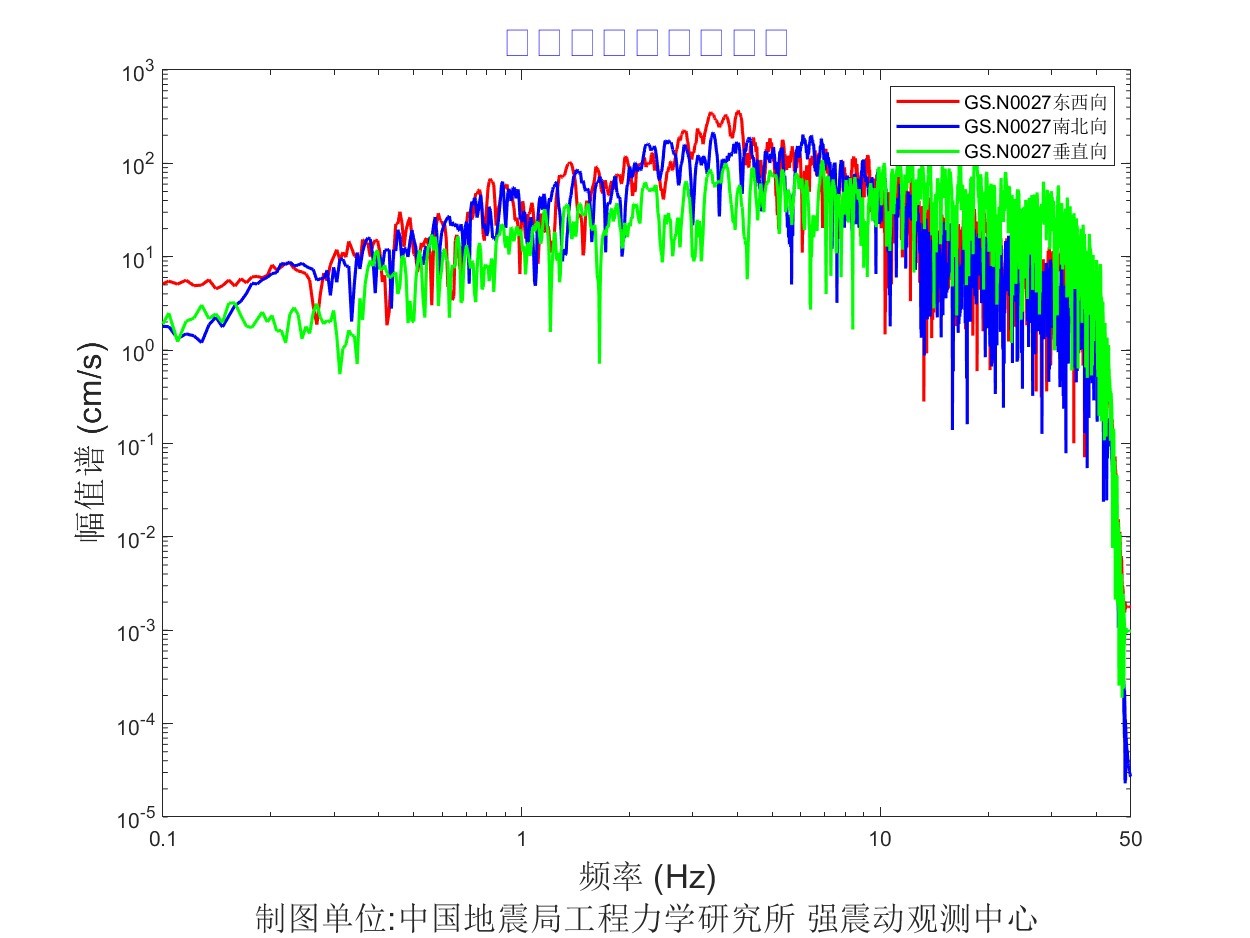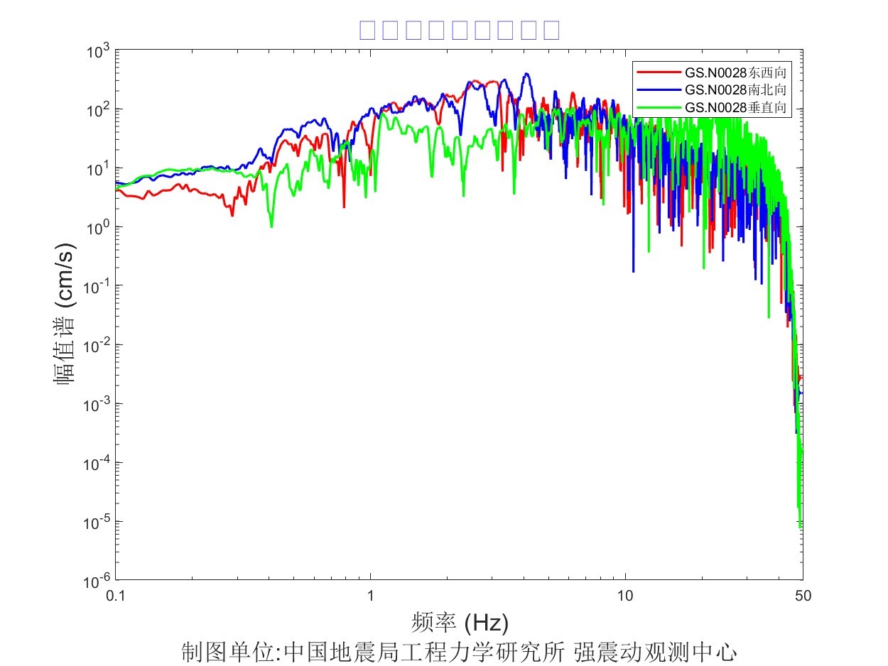 地震后工力所強震動觀測中心共收取距震中100公里范圍內實時強震儀記錄57組、烈度儀記錄182組。中心立即組織人員進行處理。獲取記錄臺站加速度記錄分析結果見表1,其中GS.N0028 臺烈度最大,其震中距為13.6km,東西、 南北、 垂直向加速度峰值分別為 905.8cm/s2、778.5cm/ s2、-702.4cm/ s2,東西、南北、垂直向速度峰值分別為57.3cm/s、-52.1cm/s、-16.3 cm/s,計算儀器地震烈度9.5度。GS.N002B 臺峰值加速度最大,其震中距為12.3km,東西、 南北、 垂直向加速度峰值分別為 1071.4cm/s2、856.8cm/ s2、796.1cm/ s2,東西、南北、垂直向速度峰值分別為-30.7cm/s、-21.5cm/s、-10.1 cm/s,計算儀器地震烈度9.2度。GS.N0027臺震中距最小,其震中距為5.8km,東西、南北、垂直向加速度峰值分別為823.9cm/s2、-533.3cm/ s2、 692.7cm/ s2,東西、南北、垂直向速度峰值分別為-39.8cm/s、-28.9cm/s、-11.3 cm/s,計算儀器地震烈度8.8度。儀器地震烈度分布圖見圖1,地震峰值加速度分布圖見圖2,地震峰值速度分布圖見圖3,地震加速度反應譜(T=0.3s、T=1.0s、T=3.0s)分布圖見圖4、圖5、圖6,GS.N0028 臺強震動記錄見圖7,GS.N0028臺加速度反應譜見圖8,GS.N0028臺傅里葉幅值譜見圖9,GS.N002B臺強震動記錄見圖10,GS.N002B臺加速度反應譜見圖11,GS.N002B臺傅里葉幅值譜見圖12,GS.N0027臺強震動記錄見圖13,GS.N0027臺加速度反應譜見圖14,GS.N0027臺傅里葉幅值譜見圖15。