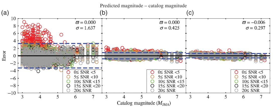 圖1 P波達到后3秒時,(a)τc方法、(b)Pd方法和(c)SVM-M模型的震級估計誤差與震級和信噪比的關(guān)系