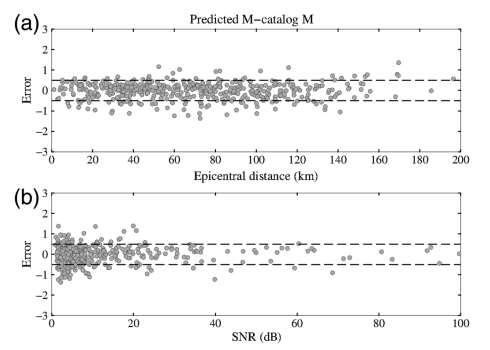 圖2 P波到達(dá)后3秒,基于TLSVM-M模型的單臺(tái)震級(jí)估計(jì)誤差與(a)震中距和(b)信噪比的關(guān)系